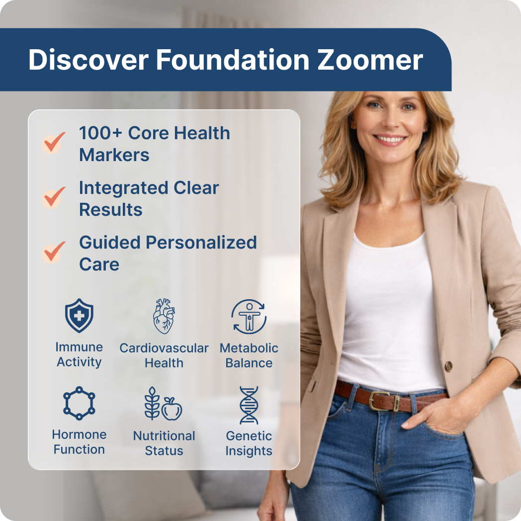 Foundation Zoomer gives you a grounded starting point for understanding your whole-body health. It shows how key systems including your heart, metabolism, hormones, and immune response relate to one another and where imbalances may be building. These insights help shape a roadmap that you and your provider can use to guide care with more intention and less guesswork.
