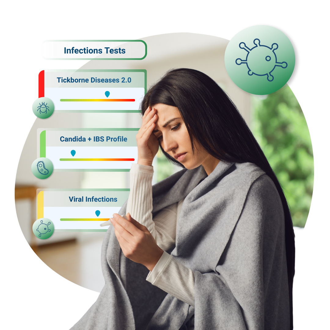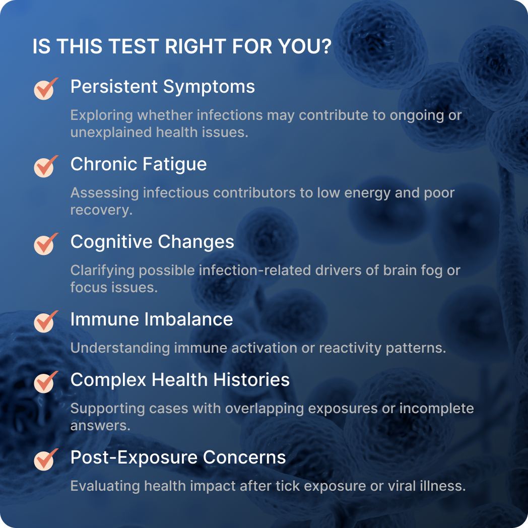 Infections can influence health in complex and often overlapping ways. Infection testing helps identify immune responses to organisms that may contribute to persistent symptoms, inflammation, or immune stress. Rather than diagnosing disease, these tests provide clarity. By evaluating immune response patterns across a range of organisms, infection testing helps determine whether infectious exposure may be influencing ongoing health challenges and supports a more targeted, informed approach to next steps.