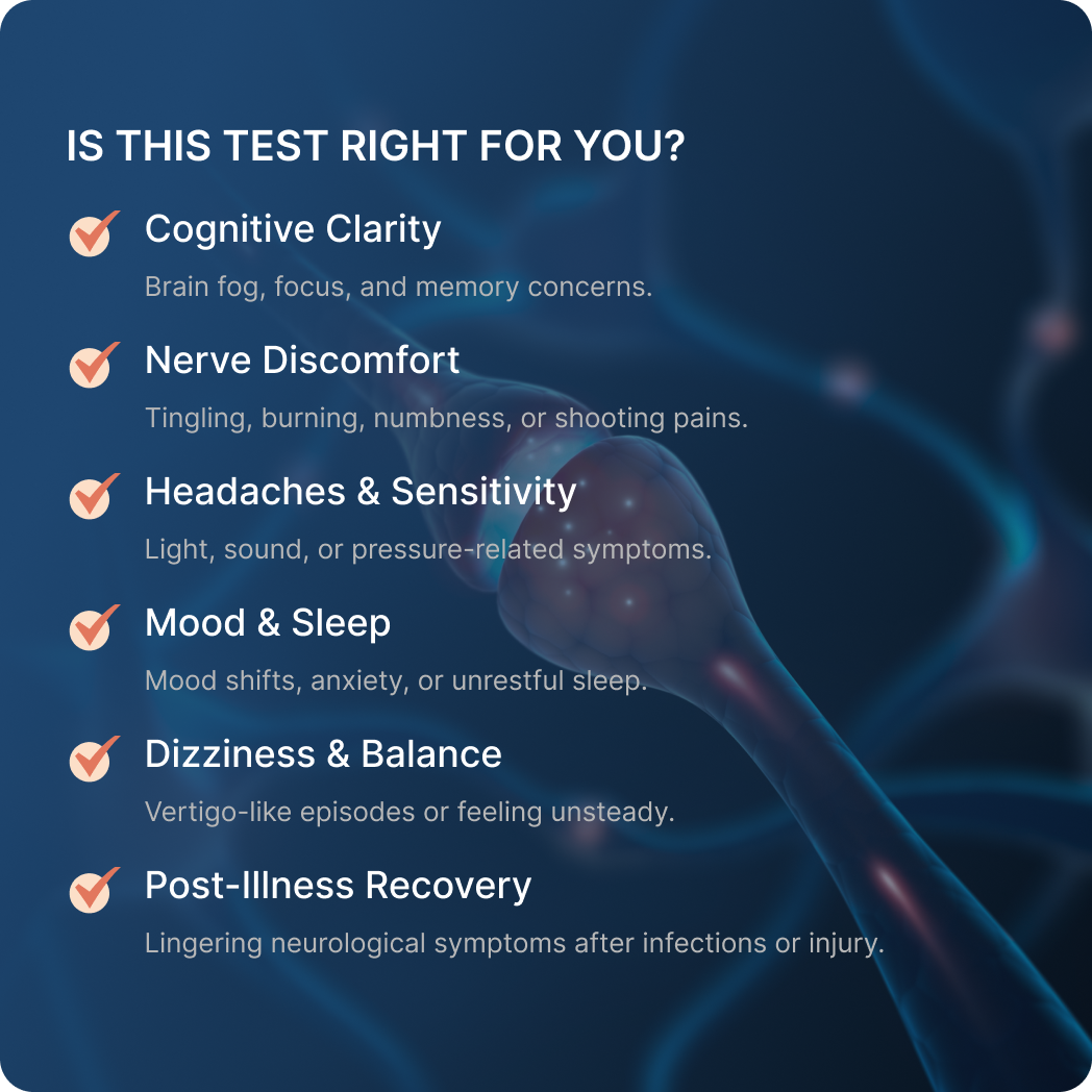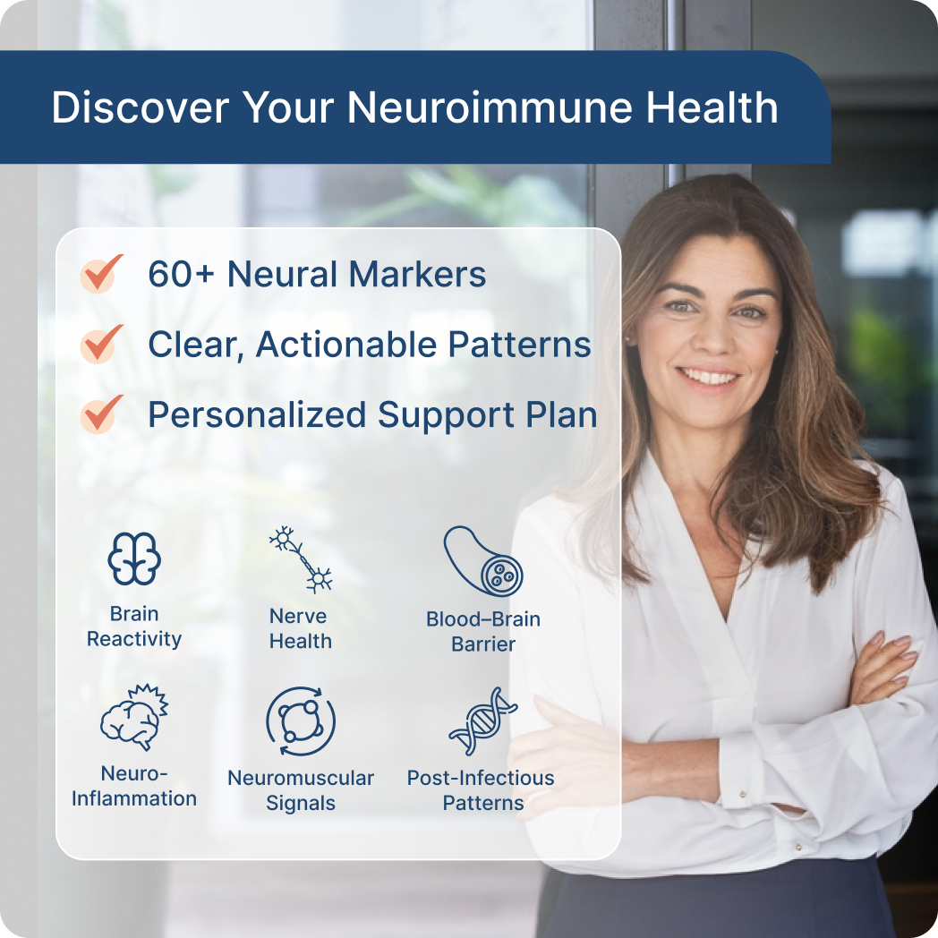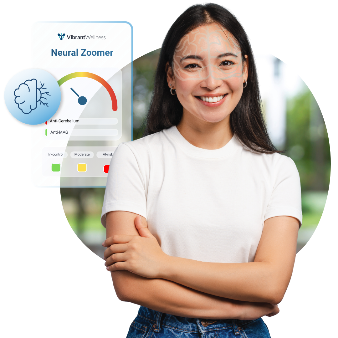 Neural Zoomer offers a clear, clinically meaningful view of how immune activity may be influencing your brain and nervous system. By measuring antibodies tied to neuroinflammation, brain and nerve structures, and blood–brain barrier balance, it brings structure to complex neurological symptoms and supports more informed, personalized care for long-term brain clarity and resilience.